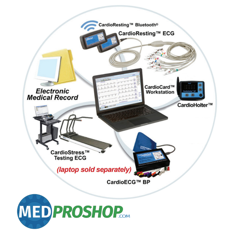 CardioStress™ features a Bluetooth and WIRELESS option for stress testing. The Stress ECG has more protocols built in and available than any other system. All systems come with a fully interpretive 12 lead diagnostic Stress ECG, measurements, serial historical comparisons, comprehensive patient charting, databases and more. This is a wireless solution for performing and managing tests while saving money and working with your existing equipment. The system is EMR compatible with an unlimited database. (combine a medical grade treadmill with your PC ECG Stress for a complete system).